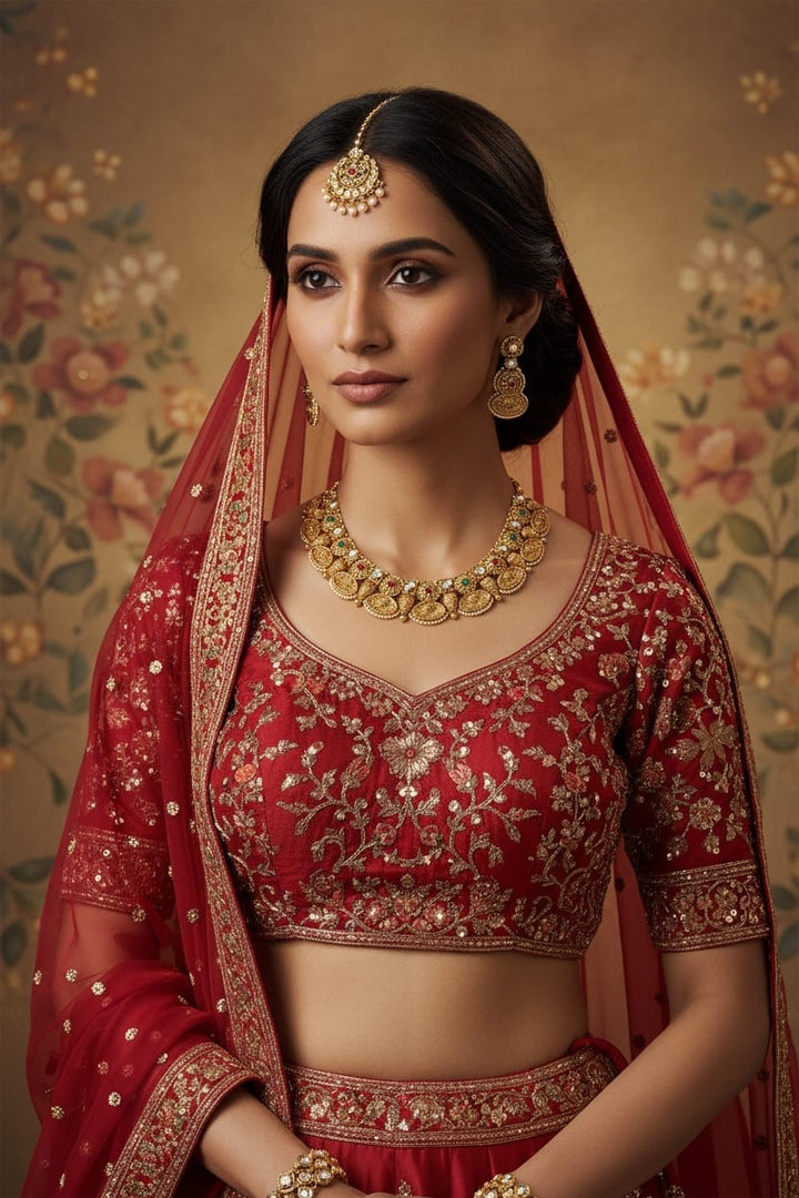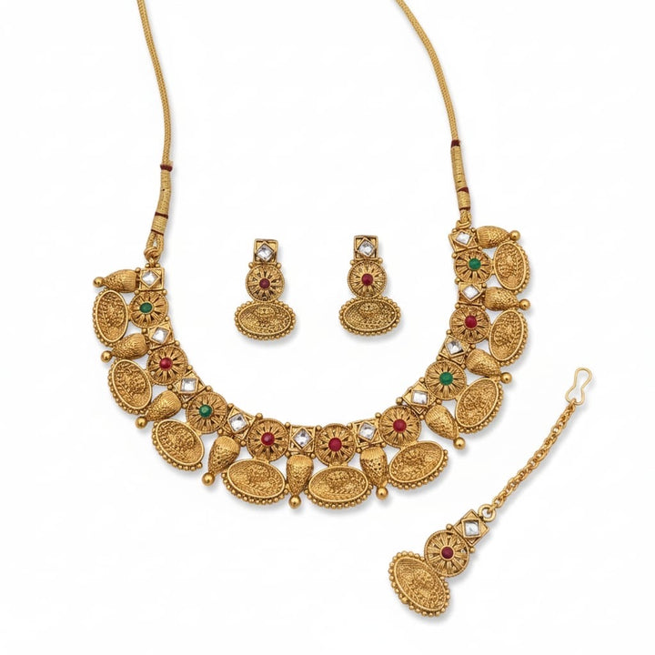 This handcrafted Antique Gold Bridal Set features intricate temple-style detailing, highlighted with ruby and emeralds-colored stones. Paired with matching earrings and a maang-tikka, this set reflects timeless Indian tradition, adding a royal touch to any ethnic outfit. Its elegant craftsmanship makes it perfect for weddings and festive occasions.