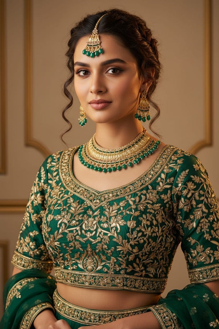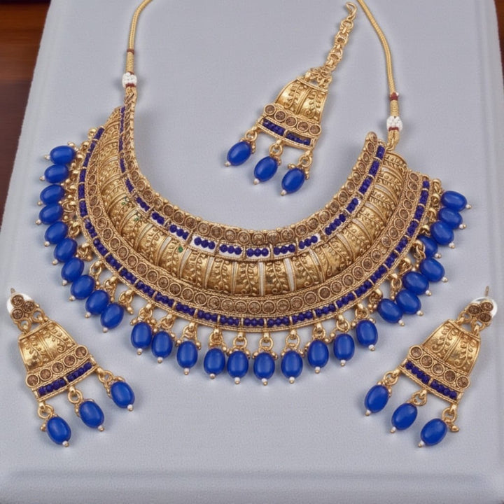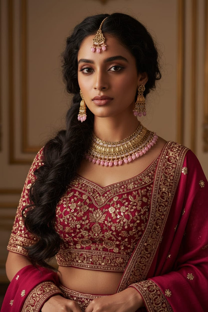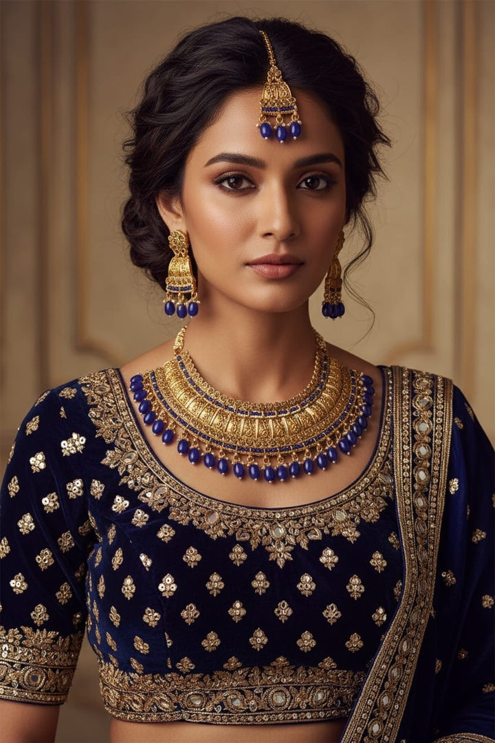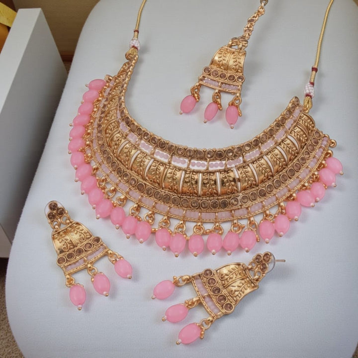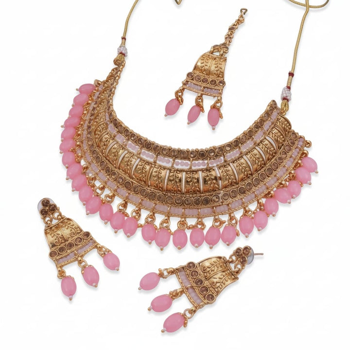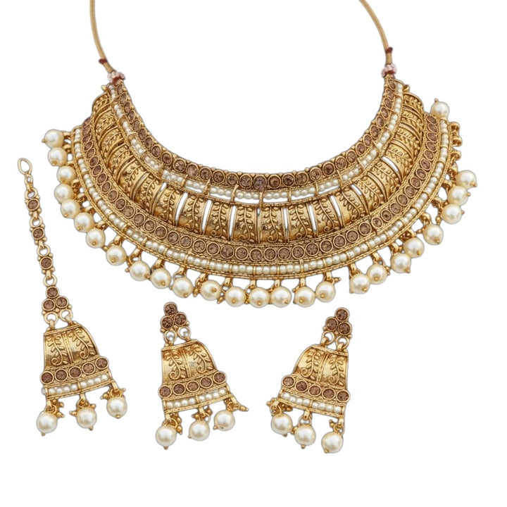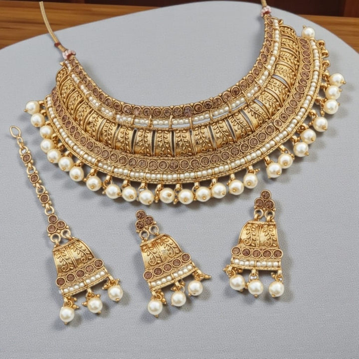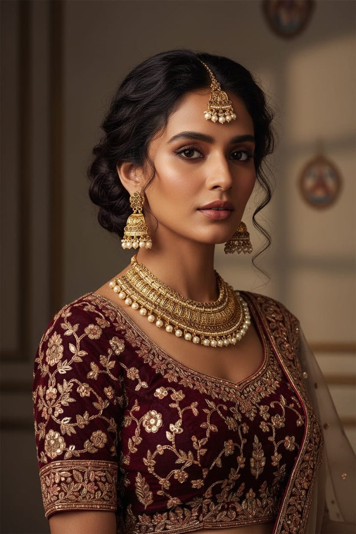 This luxurious Antique Pearl Bridal Jewellery finish choker set features intricate temple-style detailing adorned with elegant pearls. The rich craftsmanship and traditional design give it a regal appearance, perfectly paired with jhumka earrings and a maang tikka. Designed to elevate bridal and festive outfits with timeless elegance.
