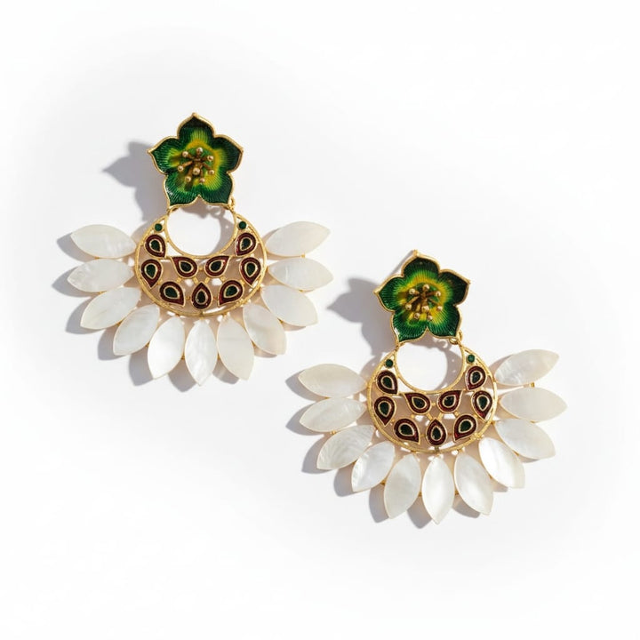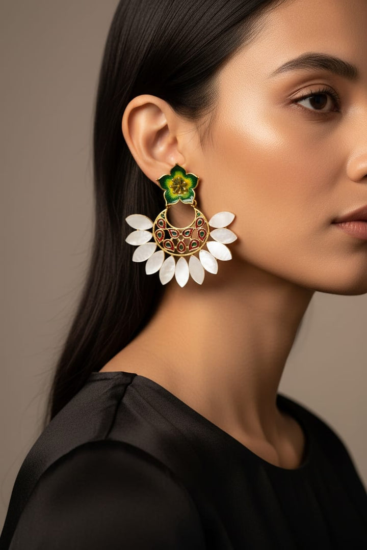 These elegant traditional Floral Pearl Heritage Drops Earrings feature a stunning blend of green enamel floral tops paired with a crescent-designed body, decorated with intricate motifs. The surrounding ivory-white petal stones add a graceful and festive charm. Crafted with premium materials, this pair beautifully merges cultural artistry with modern appeal.