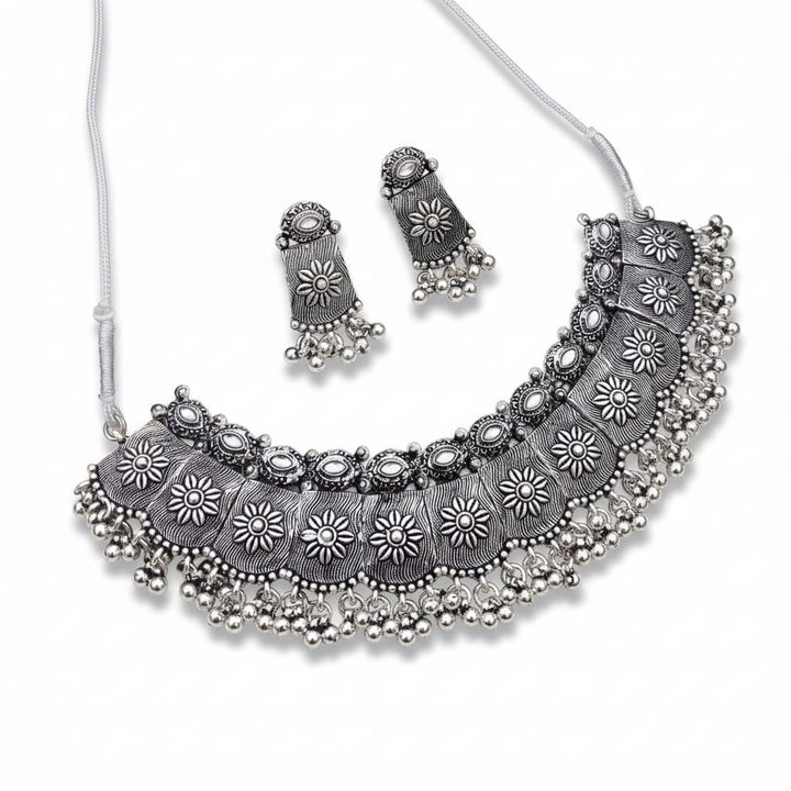 A beautifully crafted Floral Vintage Oxidized Silver Necklace Set featuring an elegant floral motif with traditional work. The necklace is adorned with intricate carvings and ghungroo-style beads that add a rich ethnic charm. Paired with matching earrings, this set brings a perfect blend of tradition and bold tribal styling.