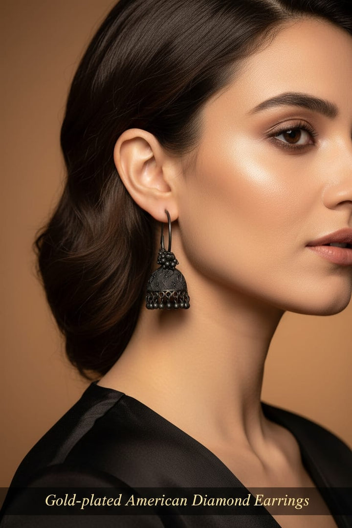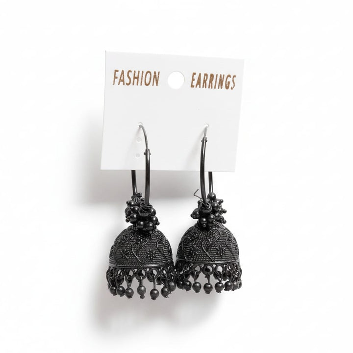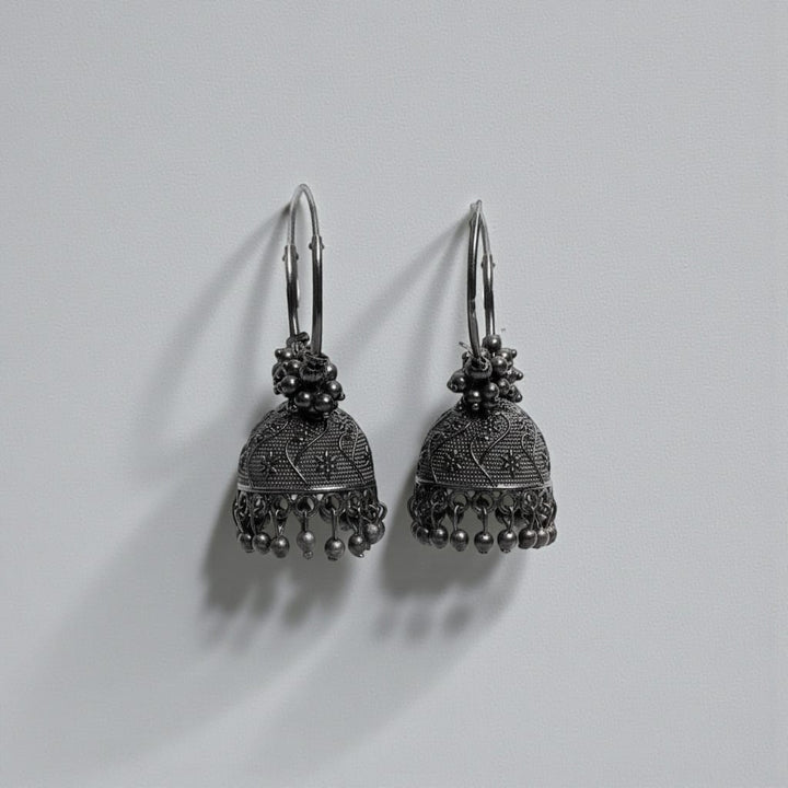 These handcrafted Royal Matt Black Silver Jhumkha feature intricate traditional carvings and delicate ghungroo detailing. Designed with a vintage dome structure, they beautifully blend ethnic charm with a timeless antique finish, making them a versatile accessory for any traditional or Indo-western look.