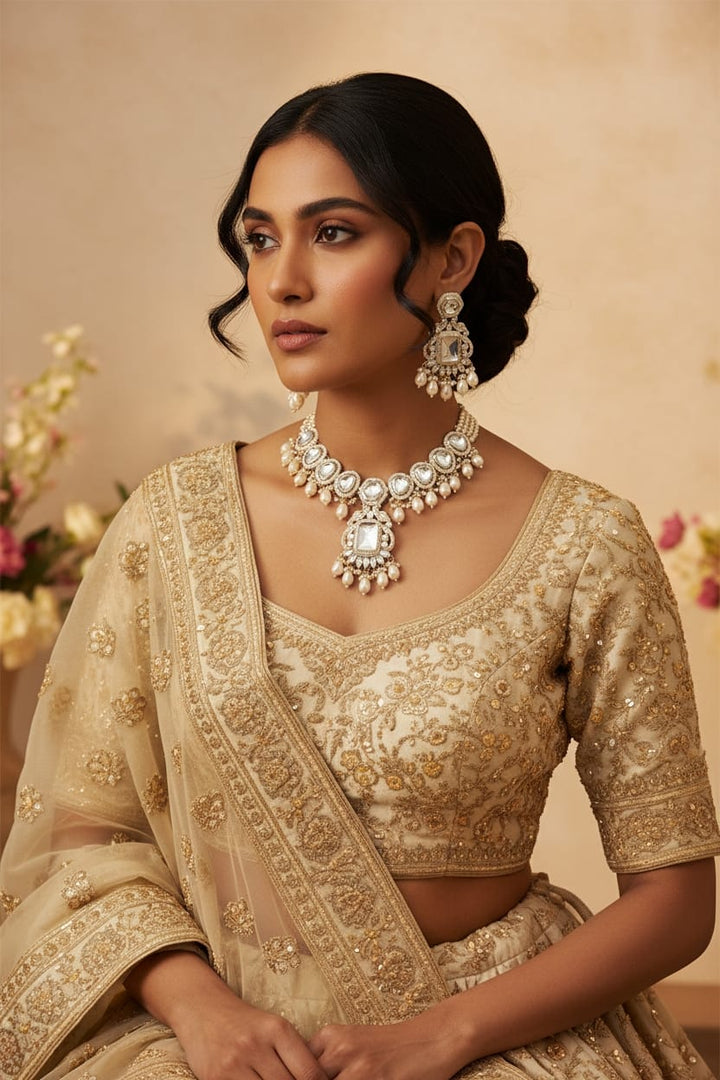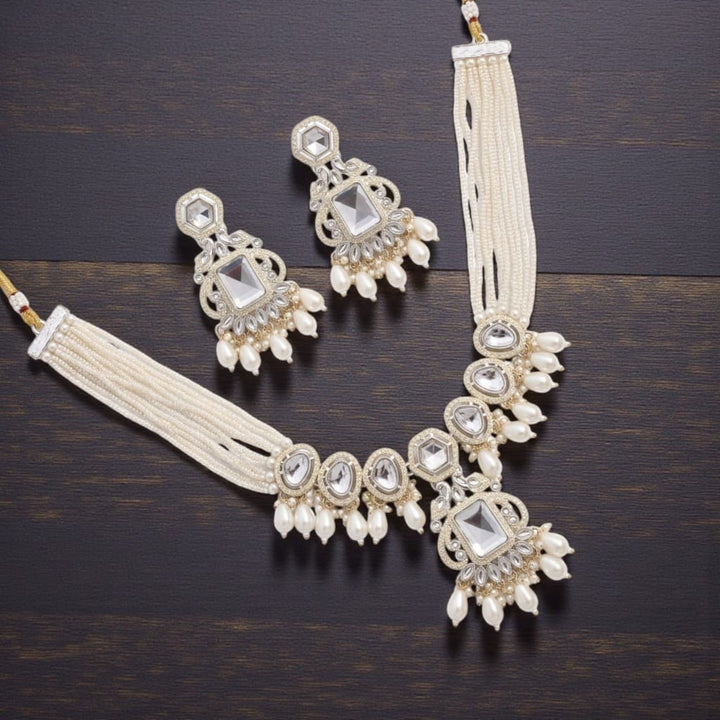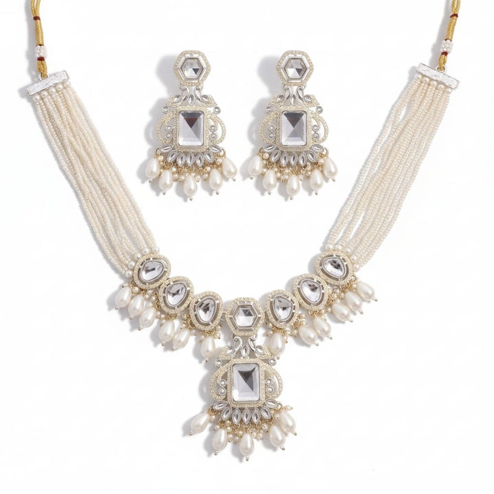 This exquisite Royal Pearl Kundan Set features a beautifully handcrafted Kundan necklace paired with matching earrings, adorned with mirror stones and pearl drops. The delicate multi-strand pearl design adds charm and richness, making it a perfect blend of tradition and elegance for any special occasion.