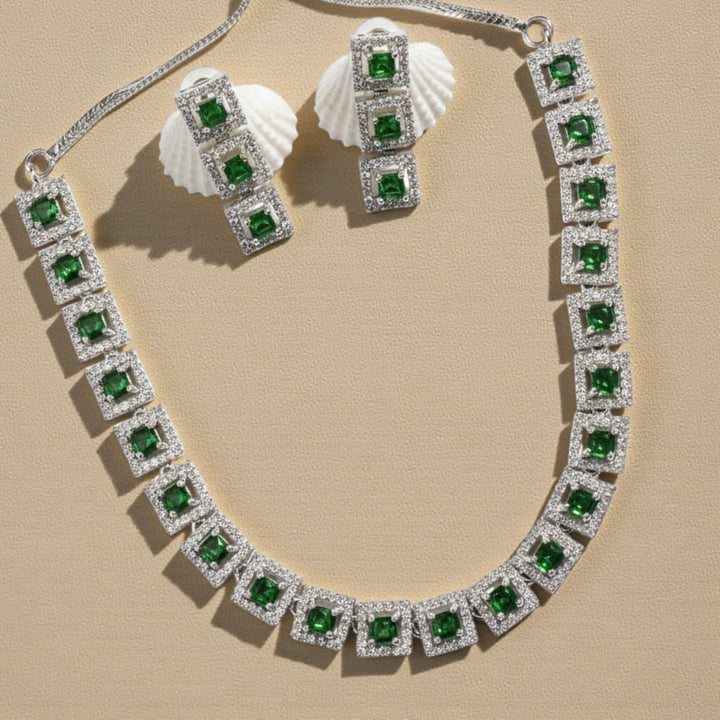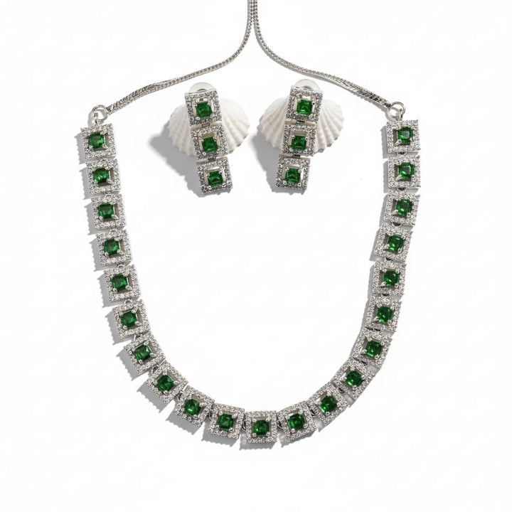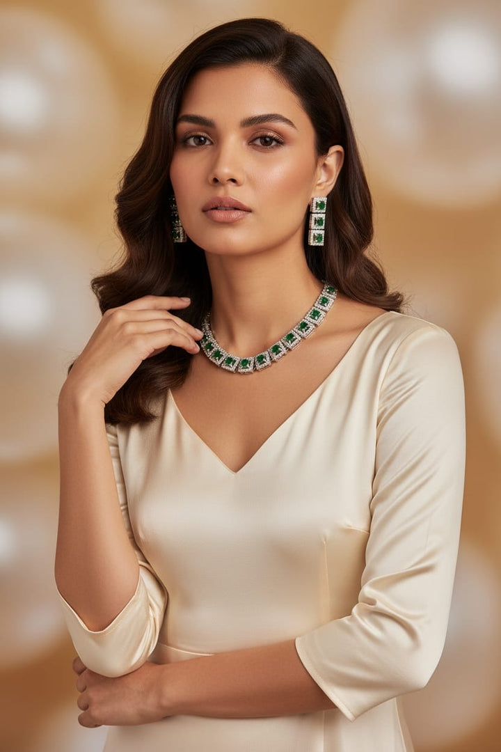 This stunning Silver Luxe Green Emerald Set features a modern square-cut design adorned with sparkling emerald-green stones framed by shimmering diamonds. Crafted with a premium silver finish, the necklace and earrings exude luxury and elegance. Perfect for both western and traditional outfits, this set enhances any look with a rich and classy touch.